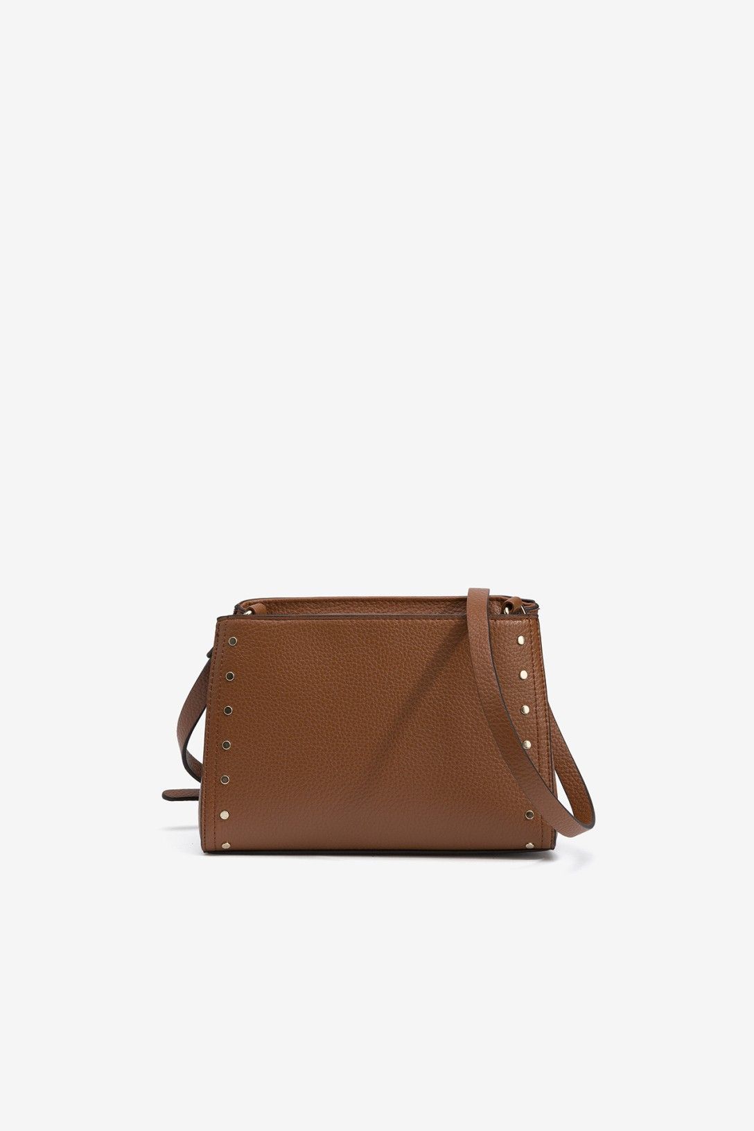 Bolsa bandolera efecto piel con apliques metálicos y cierre de cremallera superior. Correa ajustable. Interior con divisoria y bolsillo con cremallera. Tamaño Pequeño. Dimensiones: 24 x 16 x 9 cm