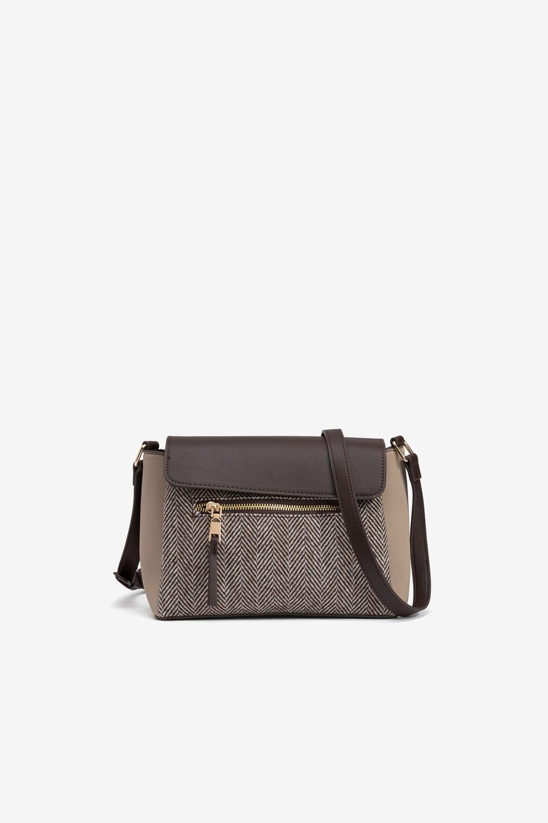 Bolso bandolera en efecto piel bicolor, combinado con textil, con 3 compartimentos, bolsillo delantero y solapa con cierre magnético. Asa ajustable y bolsillo interior con cremallera. Tamaño pequeño. Dimensiones: 24 x 18 x 12 cm