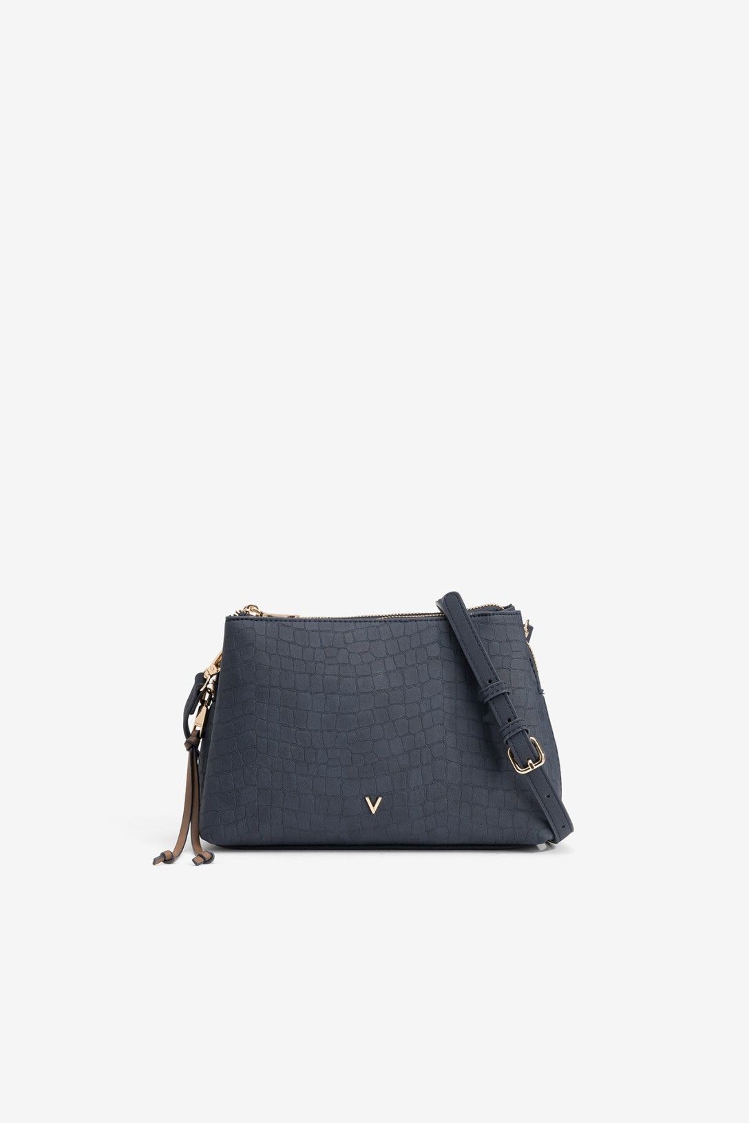 Bolso azul con textura geométrica, cierre de cremallera dorada y correa ajustable. Diseño sofisticado.