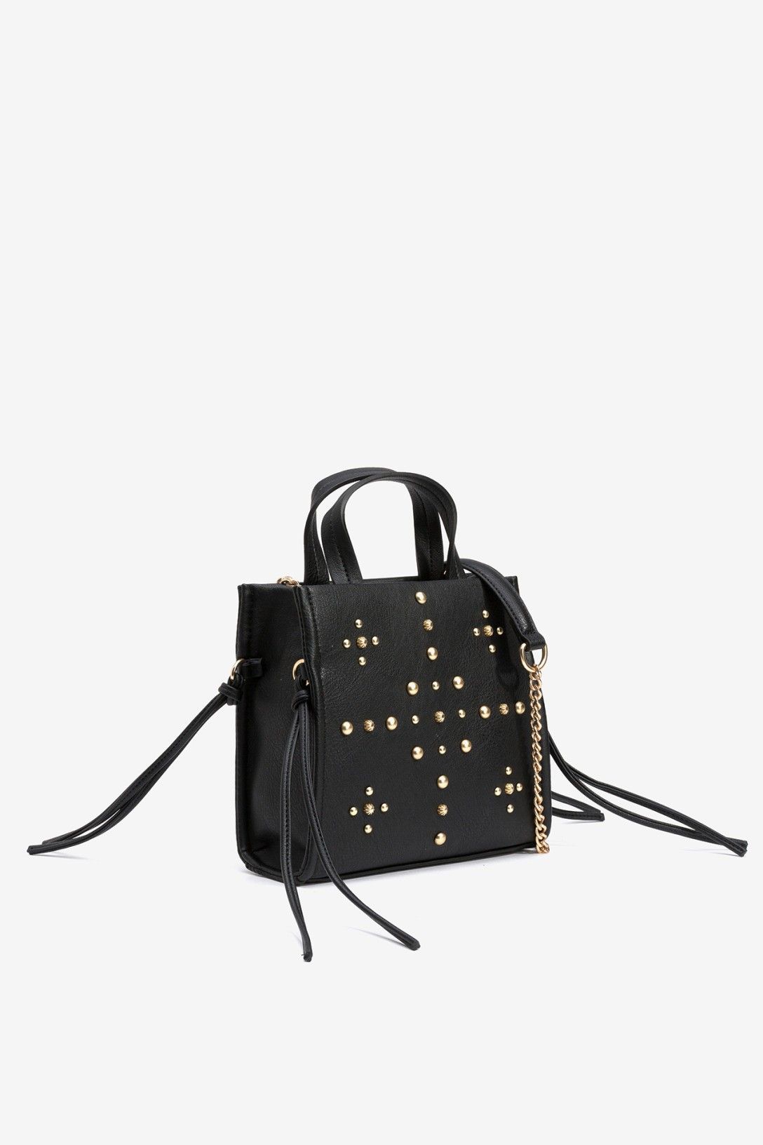 Bolso city efecto piel con apliques metálicos, flecos laterales y cierre magnético superior. Asas de mano fijas y correa bandolera ajustable y extraíble.