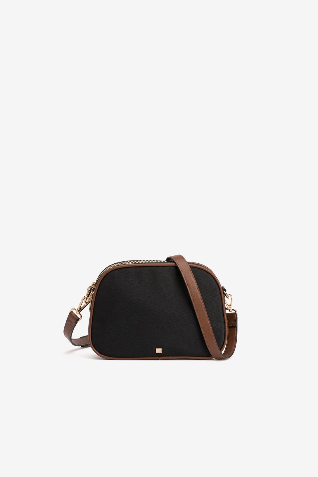 Bolso bandolera bicolor con contrastes efecto piel, tres compartimentos y cierres de cremallera superiores. Correa ajustable y extraíble. Interior con dos bolsillos. Dimensiones: 24 x 17 x 7 cm