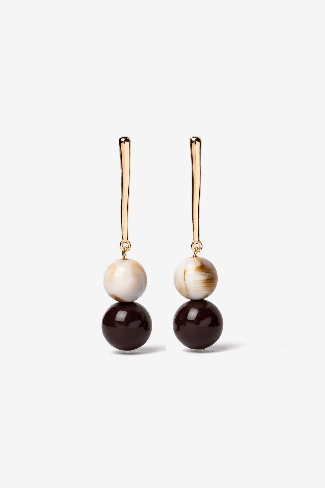 Pendientes dorados con diseño minimalista, dos esferas en tonos marrón y beige. Estilo sofisticado.