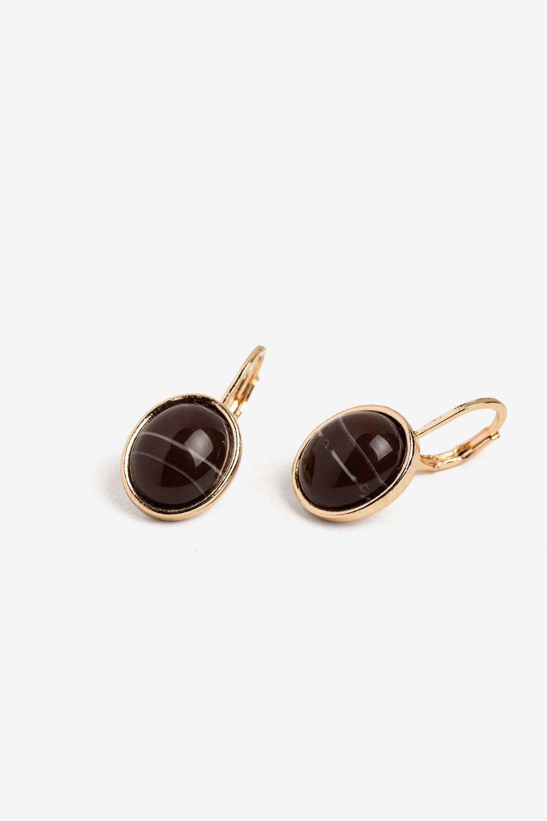Pendientes dorados con piedra oscura ovalada, diseño minimalista y cierre de gancho seguro.