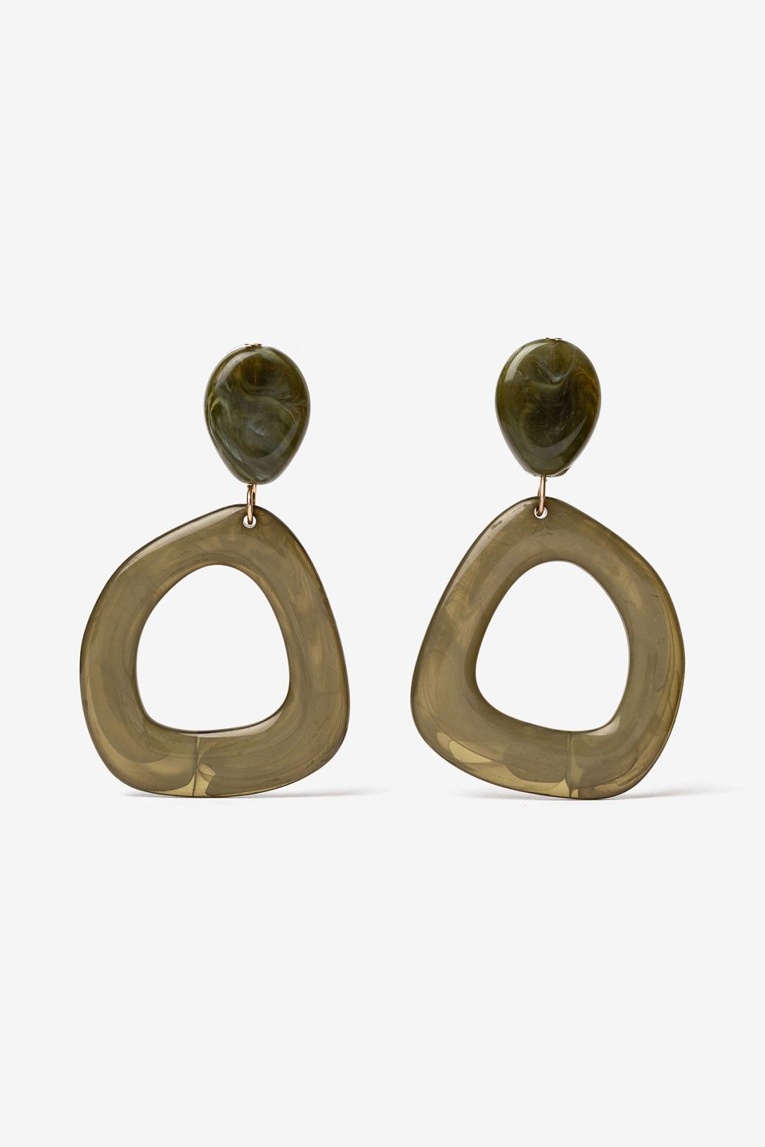Pendientes de diseño geométrico en tono verde oliva, con acabado brillante y cierre de presión.